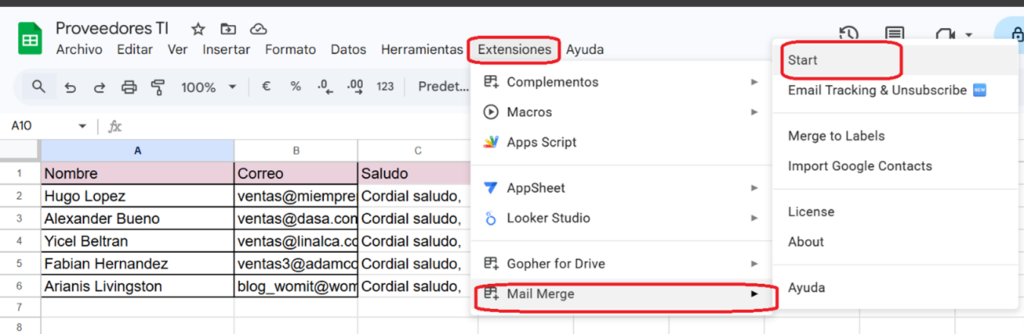 8. En Sheets ve a Extensiones → Yet Another Mail Merge → Start Mail Merge.